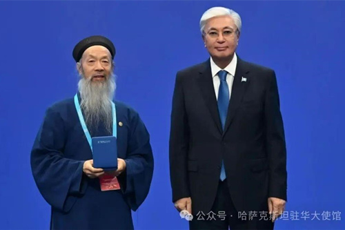9月17日,在第八届世界和传统宗教领袖大会期间哈萨克斯坦总统托卡耶夫向中国道教协会会长李光富授予二级友谊勋章,表彰促进全球对话与和平的卓越贡献。 (来源:哈萨克斯坦驻华大使馆)