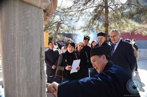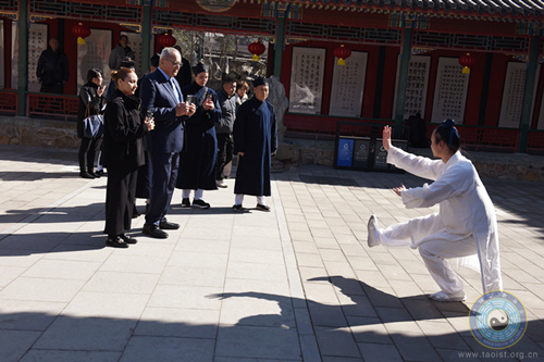 施雅德大使一行先后参观了灵官殿、玉皇殿、老律堂、邱祖殿等白云观主要殿堂,深入了解道教历史、典籍和建筑文化。大使专注聆听讲解,不时驻足拍摄、询问细节。陪同人员介绍了邱祖“一言止杀”慈悲济世的典故,分享了其中蕴含的道教热爱和平、济世利人的智慧。大使感慨道:“这正是我们当今时代所需要的宝贵财富。”