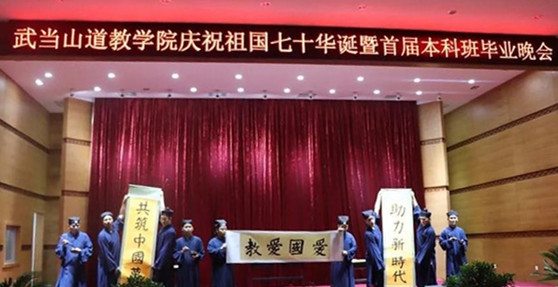 7月5日晚,武当山道教学院举行庆祝祖国七十华诞暨首届本科班毕业晚会。学员把4年来所学的知识,用4个篇章进行汇报演出。晚会以《我的祖国》开篇,在快闪《我和我的祖国》中达到高潮,在《共筑中国梦》的歌声中圆满落幕。晚会激荡着爱国热情,充分展示了新时代道教学员爱国爱教的精神风貌,表达了对祖国的感恩之心。学员们纷纷表示要始终高举爱国主义旗帜,拥护中国共产党的领导,坚定走中国特色社会主义道路,以爱国情、强国志、报国行向新中国成立70周年献礼。 (来源:湖北省道教协会)