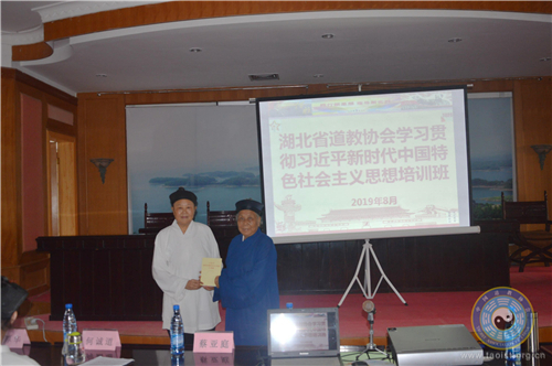 培训会上,湖北省道教协会会长吴诚真向参会人员赠送《习近平新时代中国特色社会主义思想学习纲要》