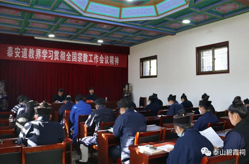 张诚达会长带领道众共同学习了习近平总书记在全国宗教工作会议上的重要讲话精神。他表示,习近平总书记的重要讲话强调宗教界加强自我教育、自我管理、自我约束,全面从严治教,带头守法遵规、提升宗教修为,并在加强宗教团体自身建设等方面提出了明确要求。全市道教界要坚决拥护。今后一个时期,泰安市道教协会要通过开展学习、培训、讲座等形式,迅速掀起学习贯彻全国宗教工作会议精神的热潮,牢牢坚持宗教中国化方向,坚持道教与社会主义社会相适应,健康有序地开展好各项工作。