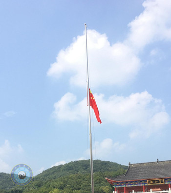 上午8时,全体人员道装齐整,神情肃穆,整齐列队,齐唱国歌,为南京大屠杀死难同胞下半旗致哀。